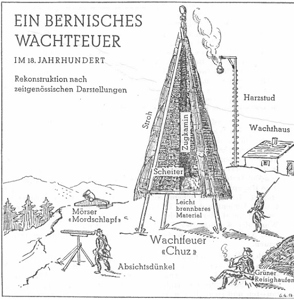 Wurde beobachtet, dass eine benachbarte Hochwacht in Brand gesetzt worden war und das Feuer mit Kanonenschüssen bestätigt wurde, wurde die eigene in Brand gesetzt.